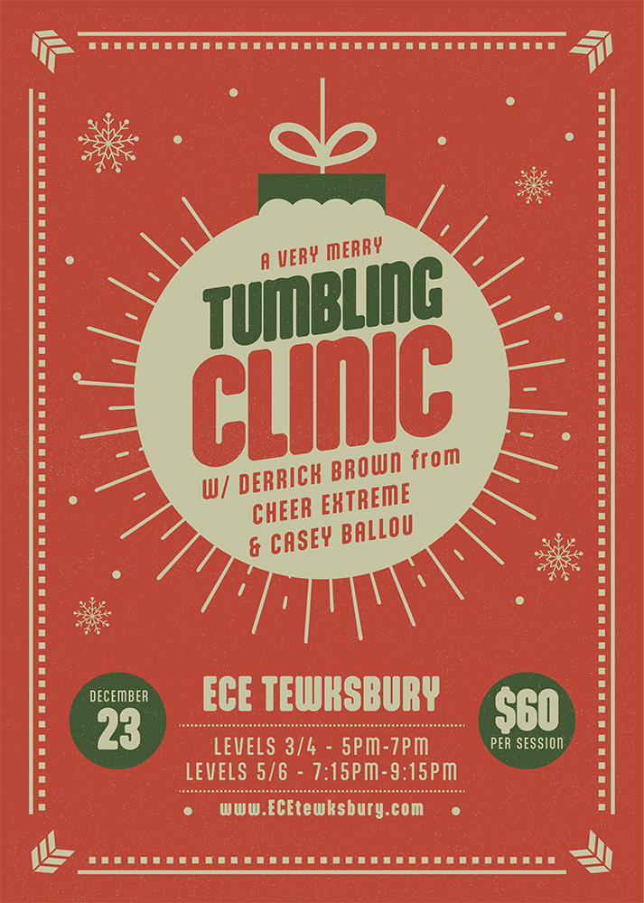 A one-day tumbling clinic for athletes ages 7 and up! No experience is required! All proceeds will go to WREATHS ACROSS AMERICA. This clinic is open to both ECE and...